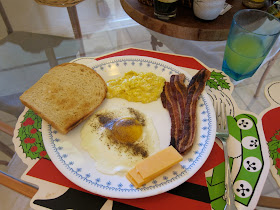 And now, a complete breakfast! I love toast and cheese with my eggs. And burnt bacon! Wouldn't have it any other way.